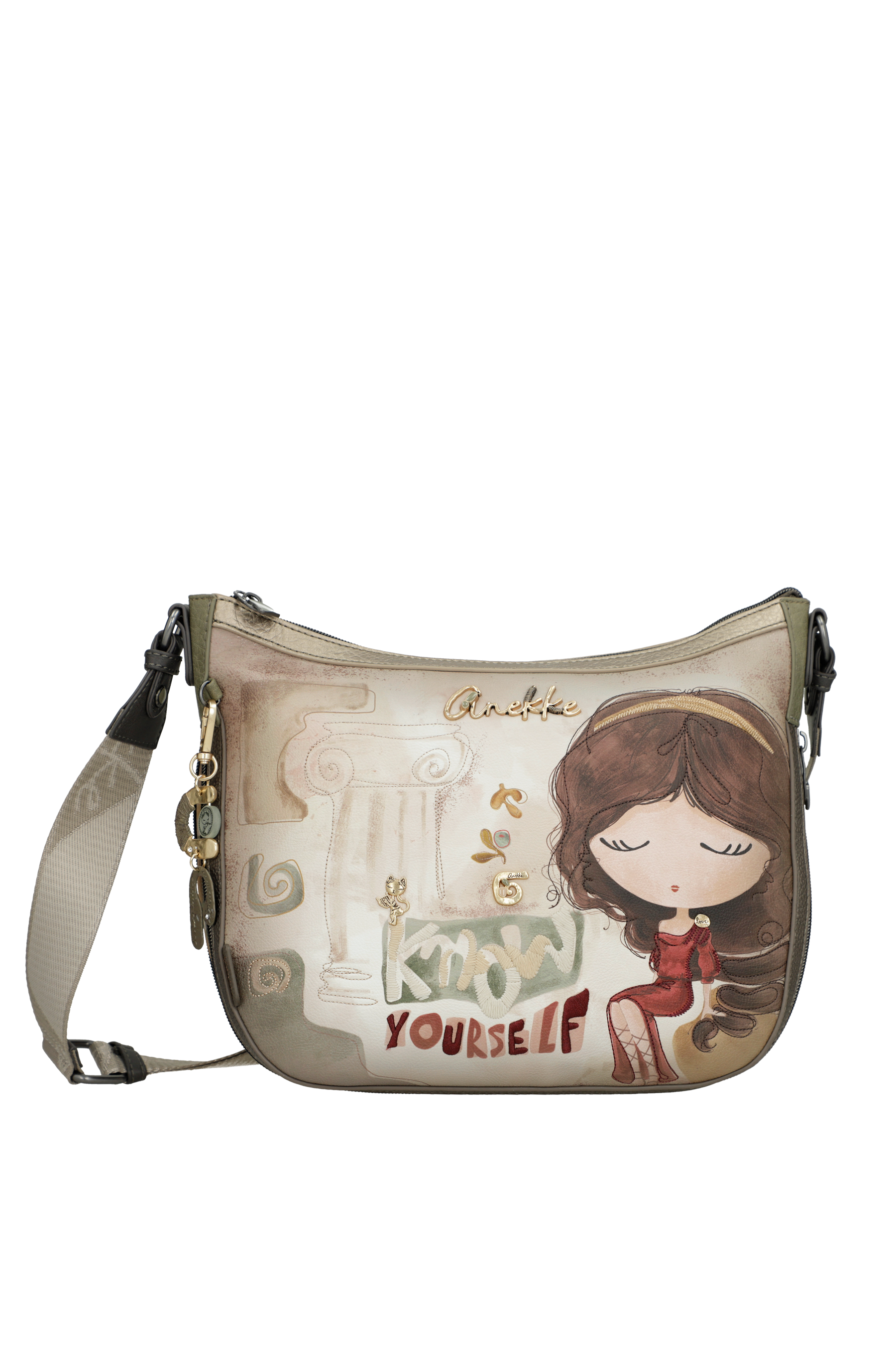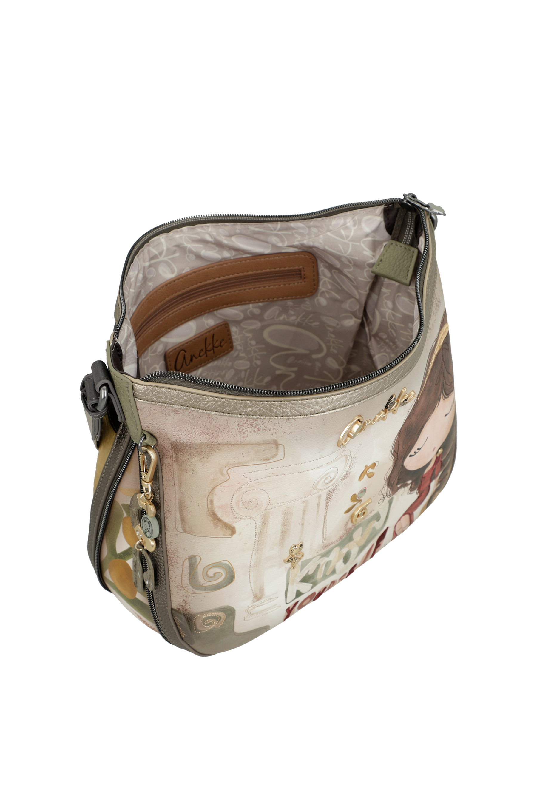 La borsa a tracolla grande Muse di Anekke è l’essenza della praticità elevata ad arte. Inserita nella capsule Muse, questa borsa non è solo un accessorio spazioso, ma un vero e proprio portale verso la Grecia antica. Il suo design è un omaggio alla culla della saggezza e della bellezza: tra stampe eteree che rievocano templi millenari e dettagli metallizzati che brillano come il sole sul Mediterraneo, ogni elemento ti ricorda che fai parte di una storia senza tempo.