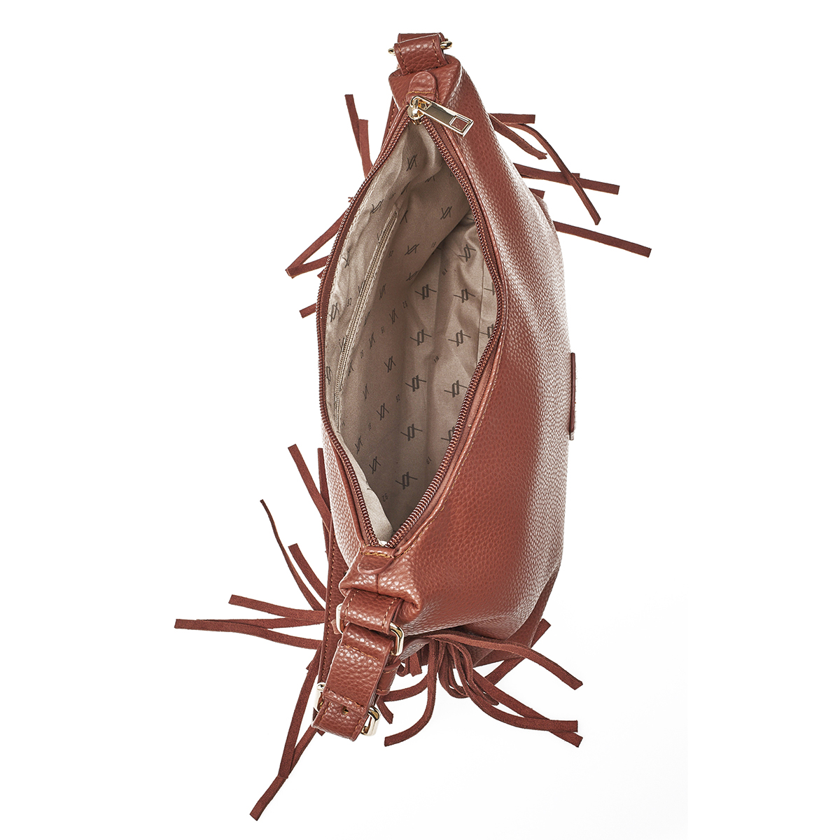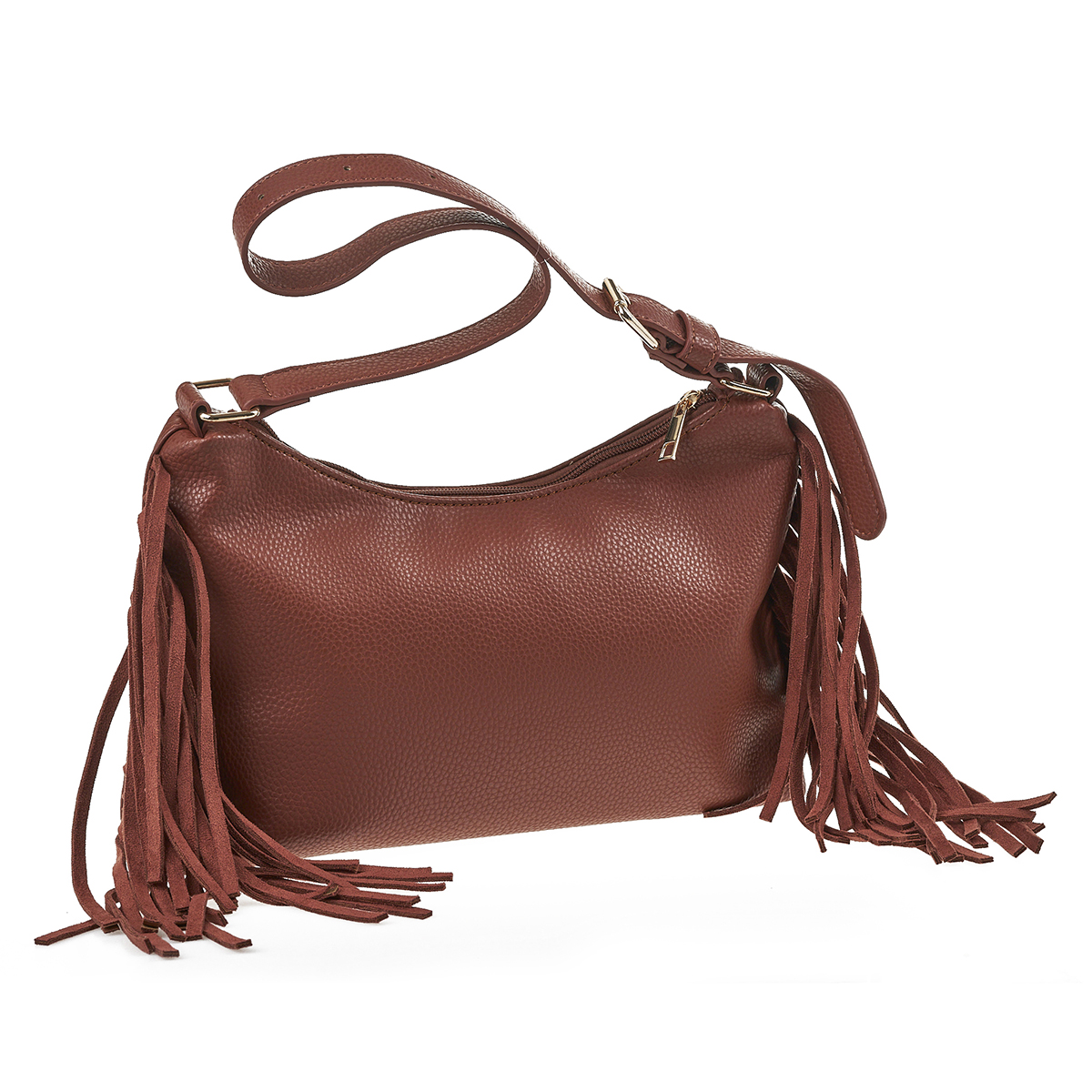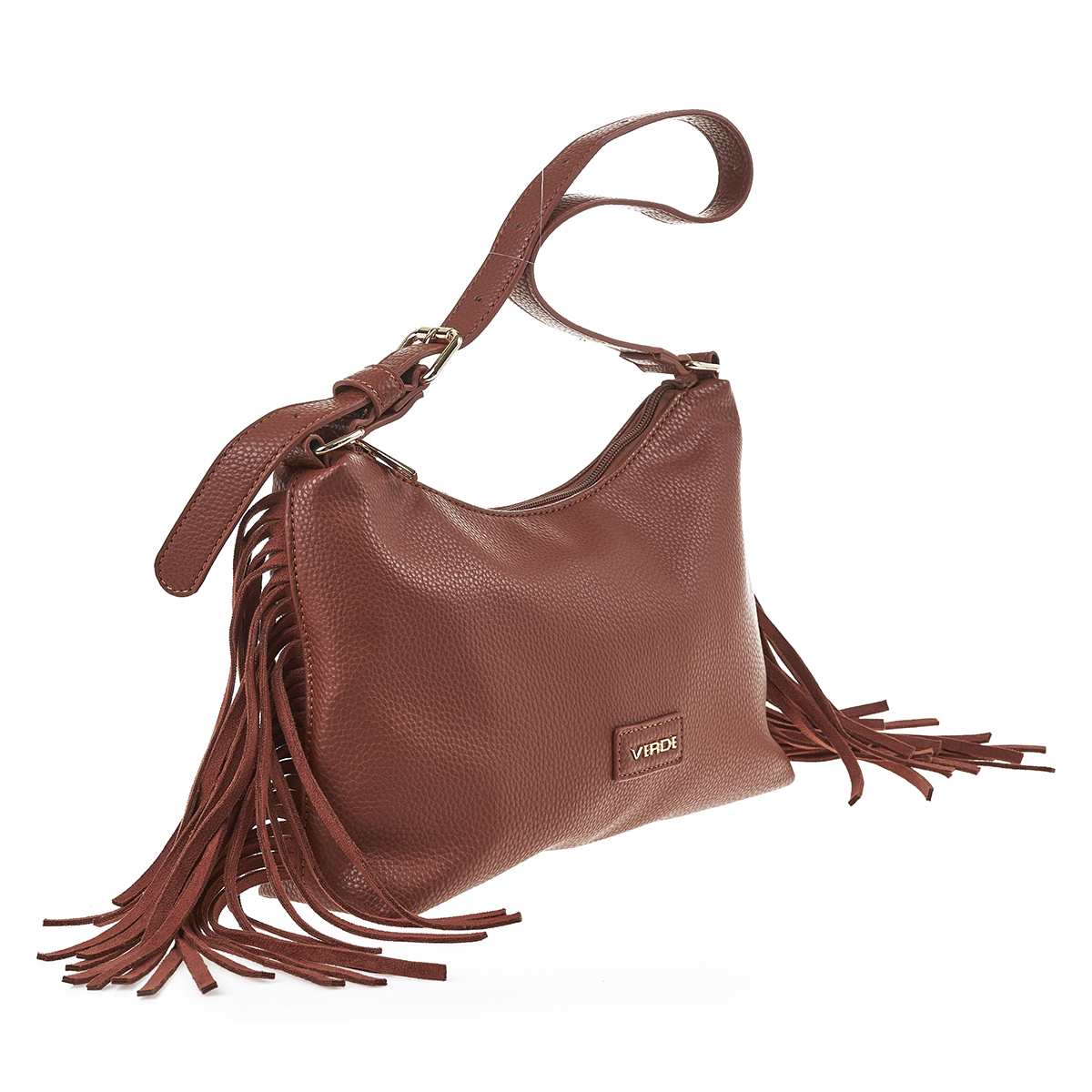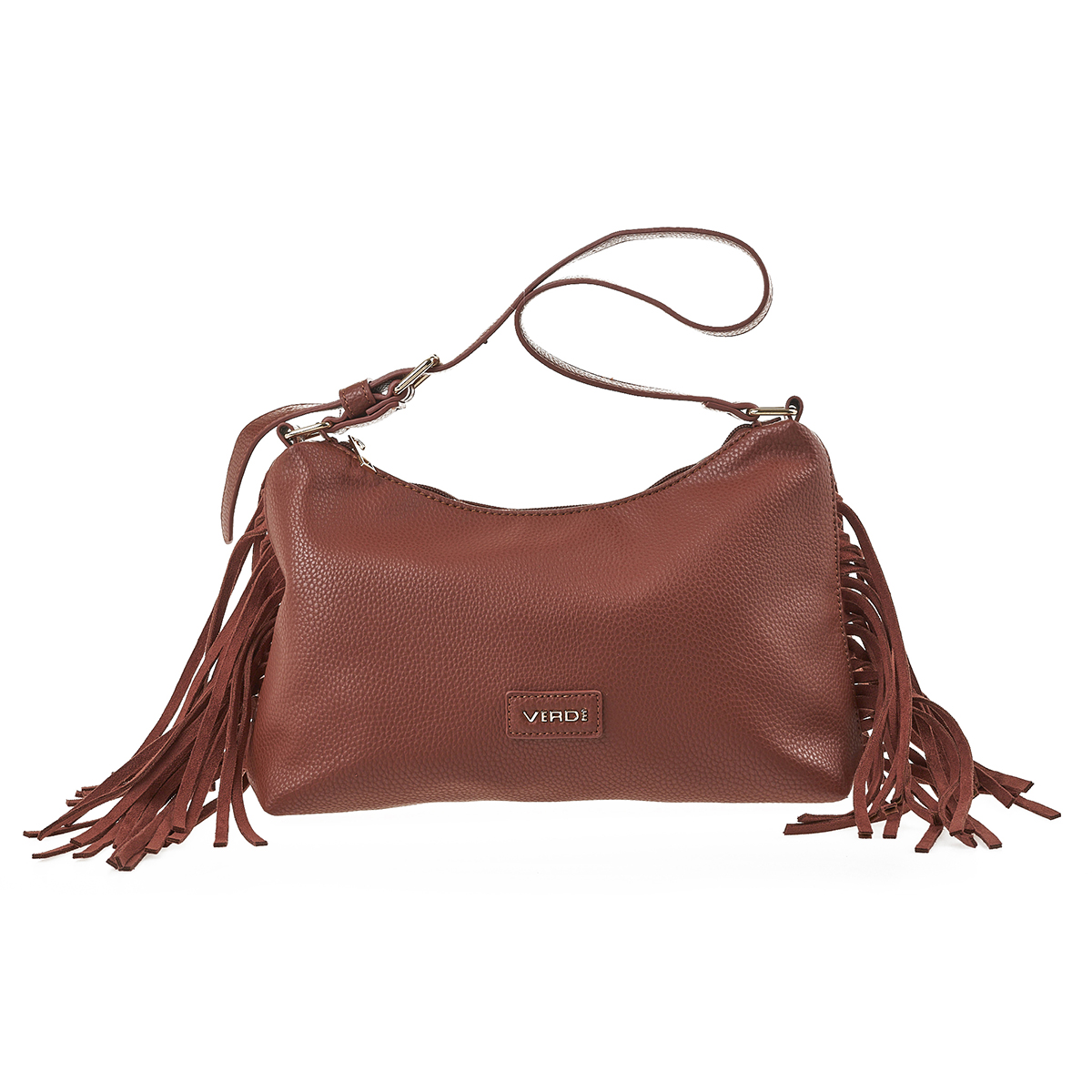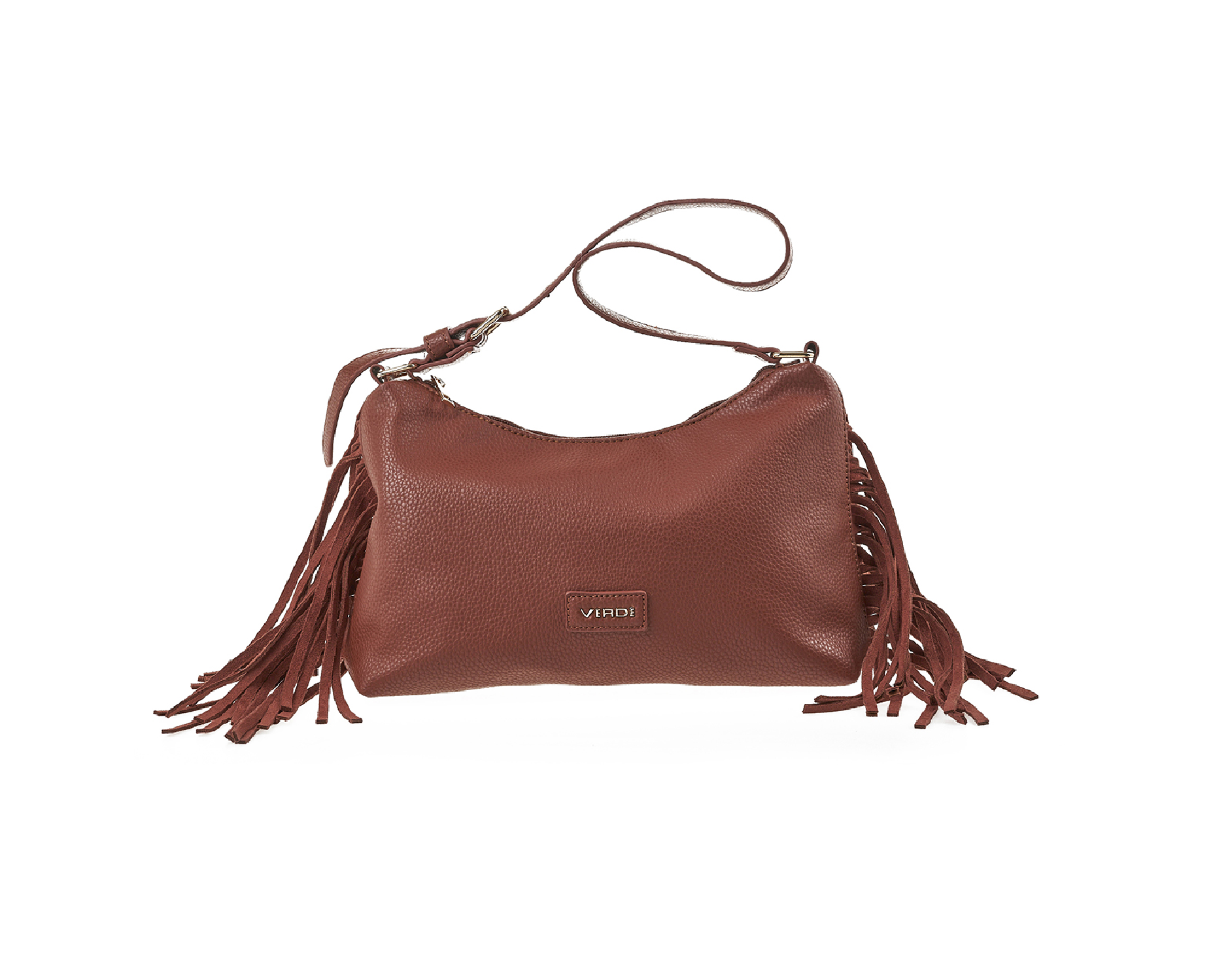 Borsetta decorata con lunghe frange laterali. Realizzata in similpelle con manico regolabile. Impreziosita da frange scamosciate. Chiusura a zip. Foderata all’interno. Firmata Verde Fashion