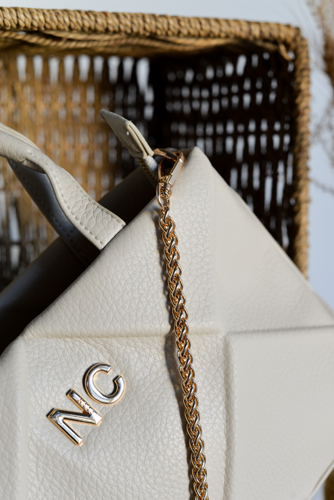 Questa borsa versatile può essere indossata come pochette in modo civettuolo ed elegante oppure come borsa a tracolla grazie alla tracolla. Le iniziali NC in metallo , segno distintivo del marchio, aggiungono un tocco di glamour discreto. Il design in stile tote bag conferisce un aspetto fresco e senza tempo, mentre l’uso di materiali ecocompatibili rafforza l’impegno dell’azienda verso una moda responsabile.