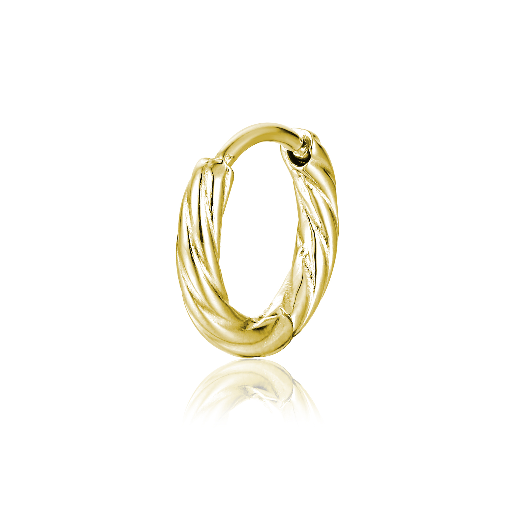 Orecchino singolo a scattino con texture twist in versione pvd oro Materiale: acciaio inossidabile Diametro orecchino: 16 mm