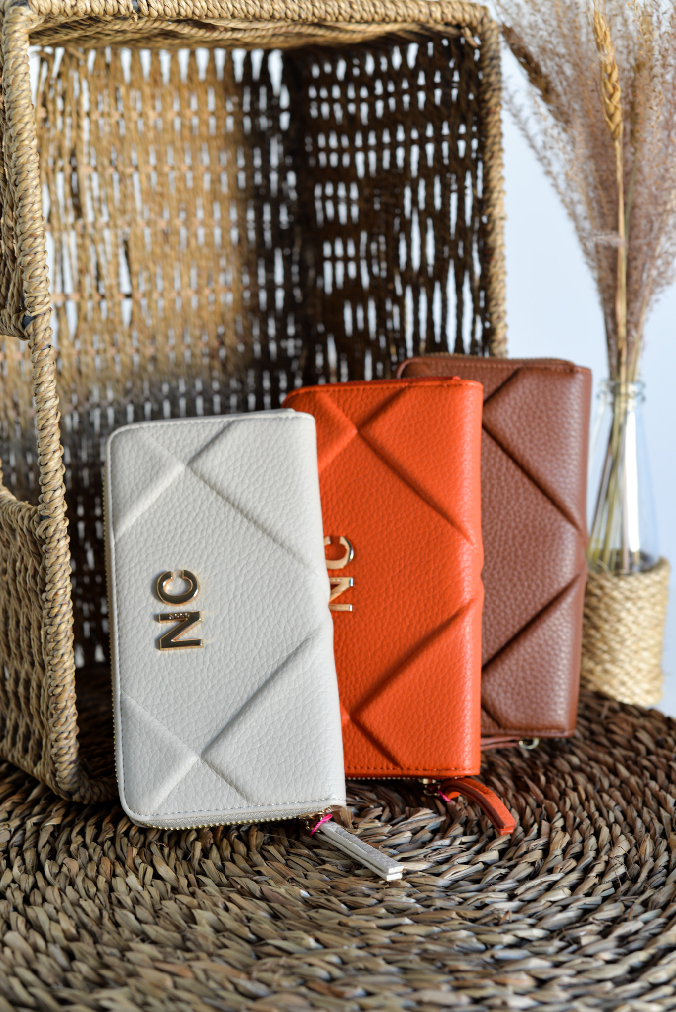 Il dettaglio delle iniziali metalliche NC sulla chiusura conferisce un tocco distintivo che riflette il carattere esclusivo del marchio. Le sue dimensioni compatte lo rendono il portafoglio perfetto da portare in qualsiasi borsa, grande o piccola, mentre il suo design sofisticato lo rende ideale per chi cerca un accessorio che si abbini a tutti i tipi di look.