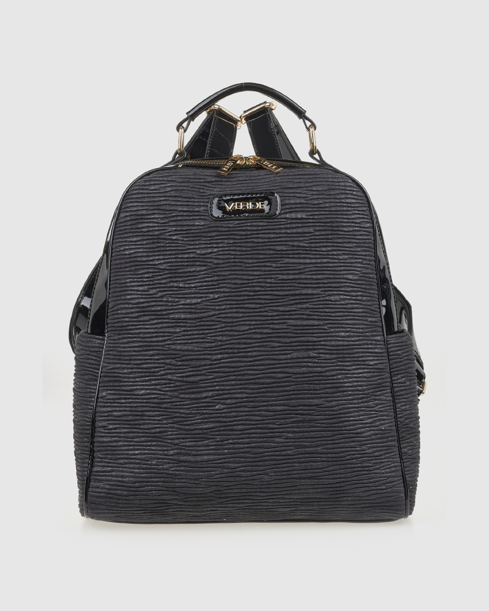 Zaino da donna, decorato con delle costine orizzontali sulle sfumature del grigio. Dettagli e manici neri in vernice. Tasche aperte laterali. Logo VerdeFashion doroato